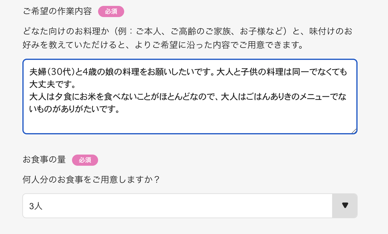 こうした細かな希望も事前に共有できるのは、初めて料理代行を頼む自分も安心できると感じました。