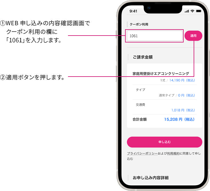 WEB申し込みの内容確認画面でクーポン利用の欄に「1061」を入力し、適用ボタンを押してください。
